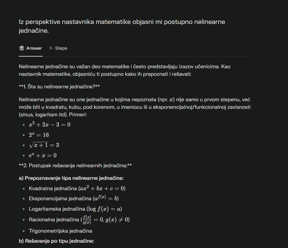 Ono što je specifično kada je reč o učenju uz pomoć veštačke inteligencije je to što ona ima mogućnost da pruži znanja iz najrazličitijih oblasti, da se prilagodi korisniku i da omogući da učenje bude interaktivno. Tako, alati poput ChatGPT, Khan Academy, ili Duolingo omogućavaju samostalno, prilagođeno učenje – tempom koji odgovara svakom pojedincu. Sam sistem „razume“ gde polaznik greši, adaptira težinu i nudi stalnu povratnu informaciju. Ovo se može posebno kontrolisati izdavanjem posebnih promptova pomoću kojih možete dati instrukcije program da se ponaša kao nastavnik matematike, profesor književnosti, inženjer…